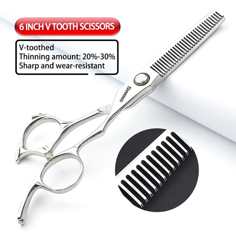 - Material: The shock absorber at the end of the handle can effectively reduce wear and noise, and the smooth stainless steel texture can reduce messy hair. It has the characteristics of heat resistance, corrosion resistance, rust prevention, and non fading. The blade is very sharp and can cut and thin smoothly and cleanly without damaging or tearing your hair