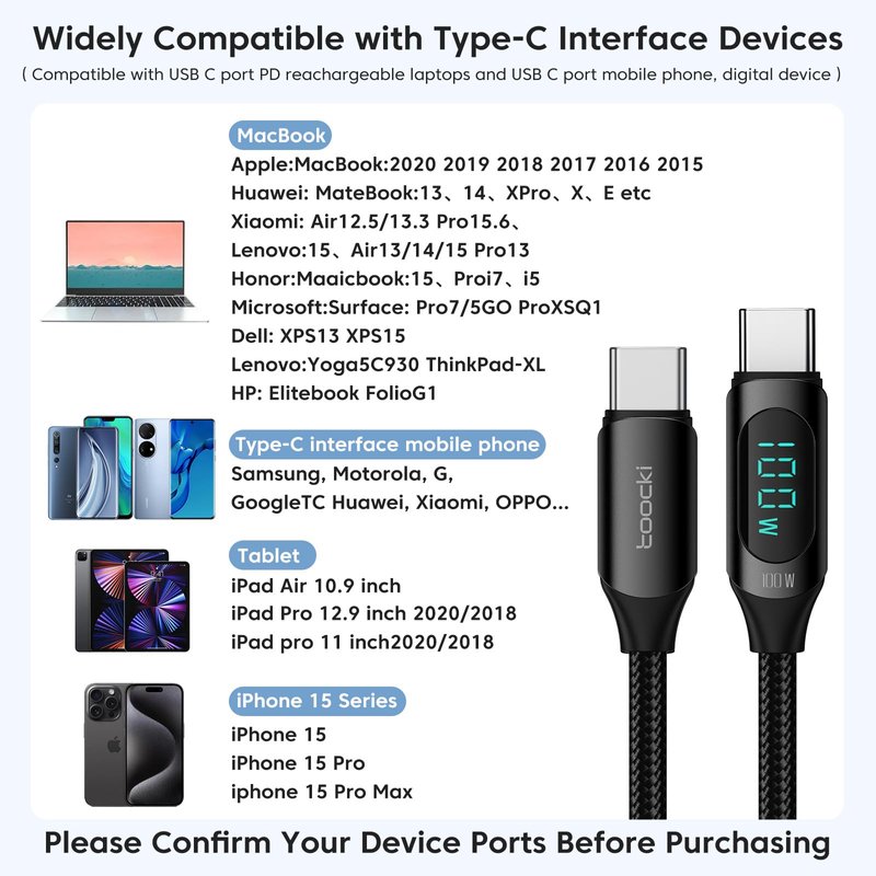- 100W USB C Super Fast Charging Cable: The LED-Display USB C to USB C fast charging cable support charging speeds up to PD 100W/5A with a maximum charging power. Which can charge most types of C devices including phones, tablets, computers, and more. full charge for MacBook Pro 13 in about 2.5h.