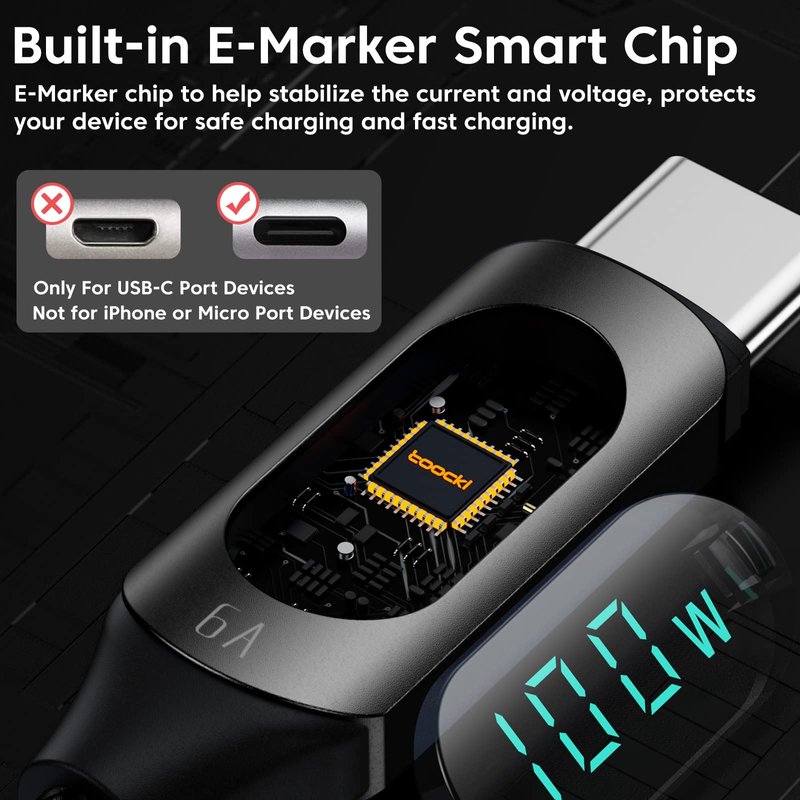 - E-marker Smart Chip: The USB C Fast Charging Cable Built-in E-Marker Chip, E-Marker chip to help stabilize the current and voltage protects your device for safe charging and fast charging.