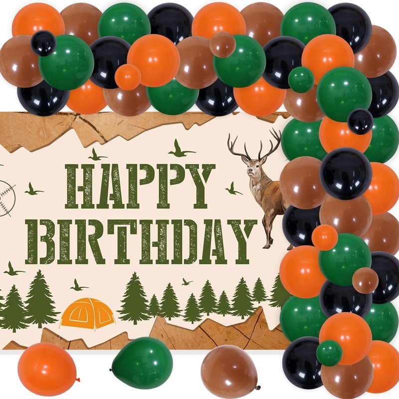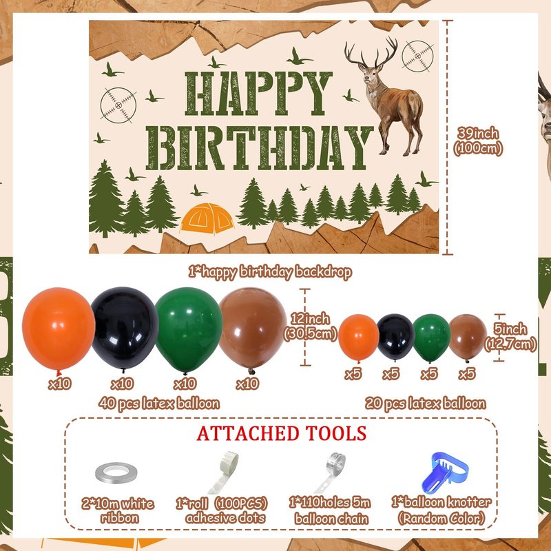 - Deer Hunting Theme Birthday Party Decorations: Our hunting party decorations set has a total of 66 pieces, including 1*happy birthday backdrop (39inch), 40*12inch latex balloon, 20*5inch colorful latex balloon and some assembly tools. . The complete set and ample quantities are enough for your party decoration needs.