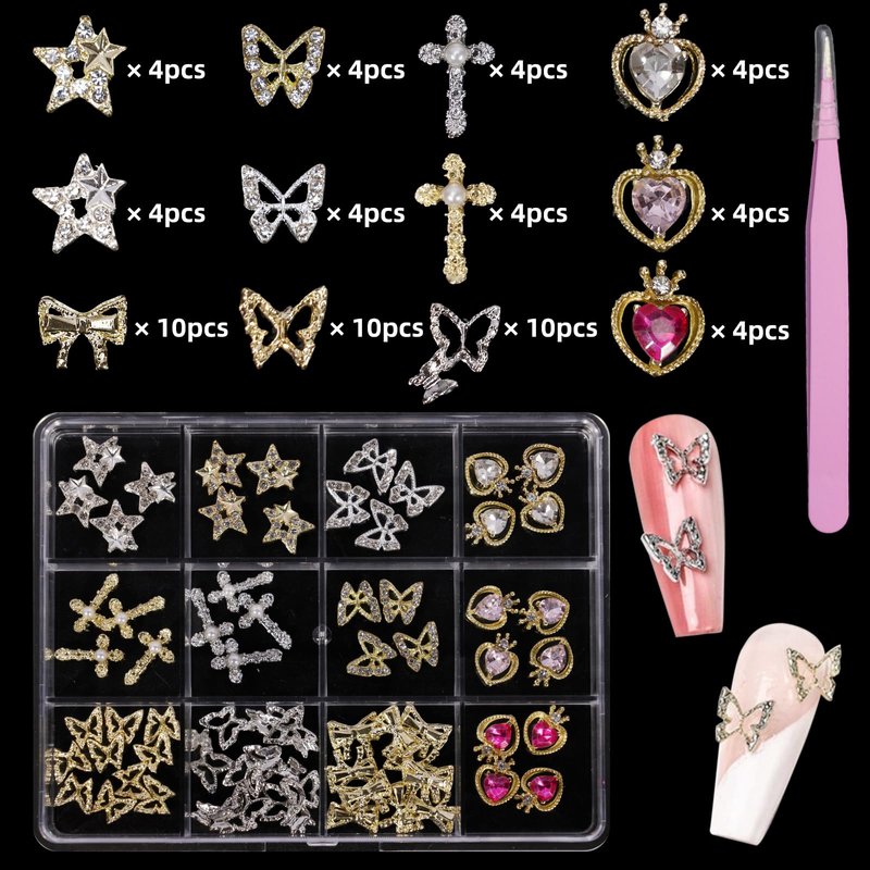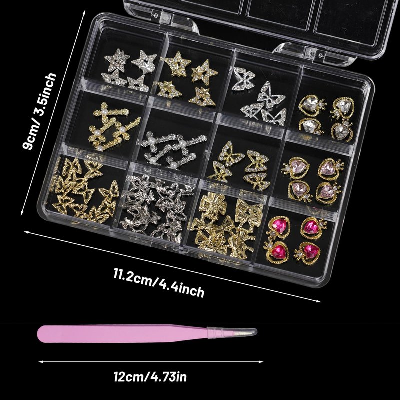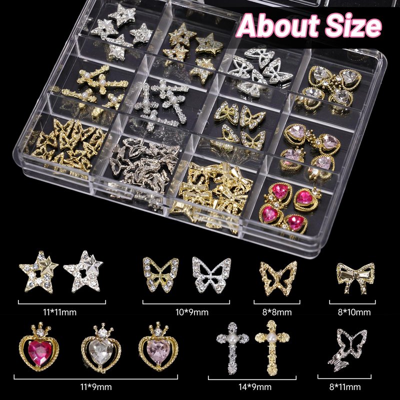 - ★Exquisite Design: They are 12 different shaped of nail rhinestones in our box, including star, butterfly, cross, heart and so on, which are enough for your daily design. The nail charms sizes are suitable for your natural nails and acrylic nails.