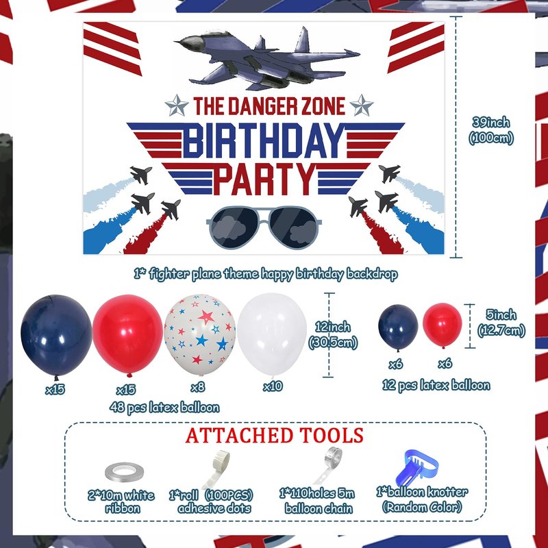 - FIGHTER JET BIRTHDAY SET: This theme set contains 68 pieces, which include 48*latex balloon(12 inches), 12*latex balloon(5 inches), and 1* fighter Jet backdrop. Moreover, some assembly tools are also included in the packaging to help you assemble party decorations more easily.