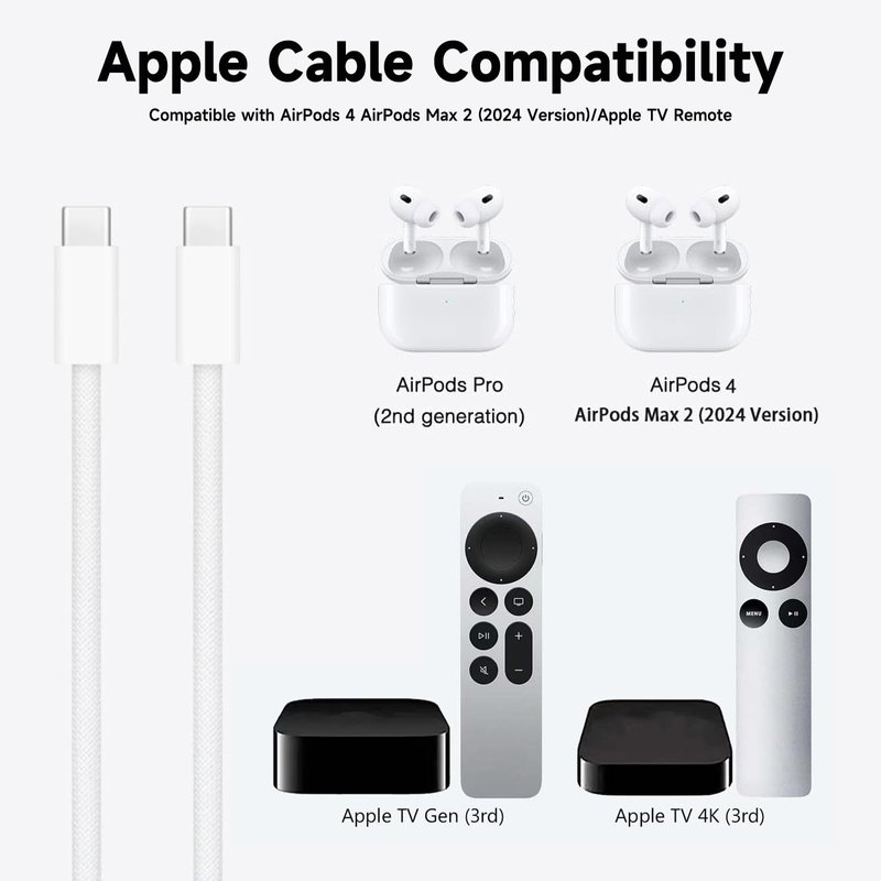 - 1. ✅Designed for AirPods Pro(2nd generation) and AirPods 4, AirPods Max 2 (2024 Release). USB C to USB C Woven Cable for Apple TV Remote (3rd Gen), Apple TV Remote 4th Gen, Siri Remote (3rd Gen), Apple TV 4K Remote (3rd Gen), Apple TV Siri 4th Gen. This Charger supports iPhone, IPads, Remote and AirPods headsets with USB C port.