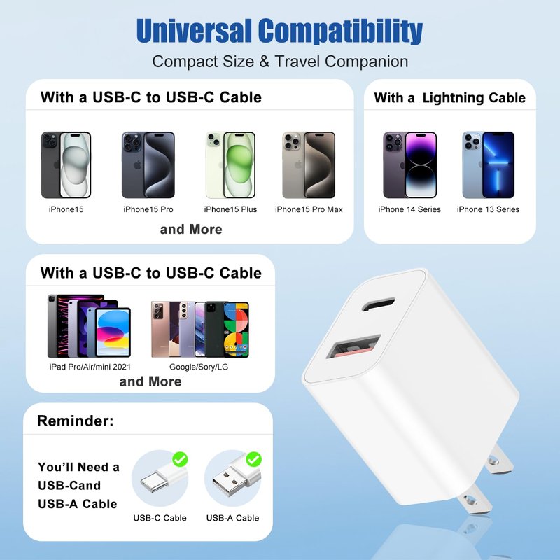 - [High-Speed Charging & Dual Port Design] The fast charger block, with an output power of 20W, featuring USB-C and USB-A ports, frees you from the clutter of various interface chargers. It enables simultaneous high-speed charging of two devices. Your iPhone 15 can be charged up to 60% in just 30 minutes, which is 75% faster than the ordinary 5W charger, saving you over 1.5 hours.