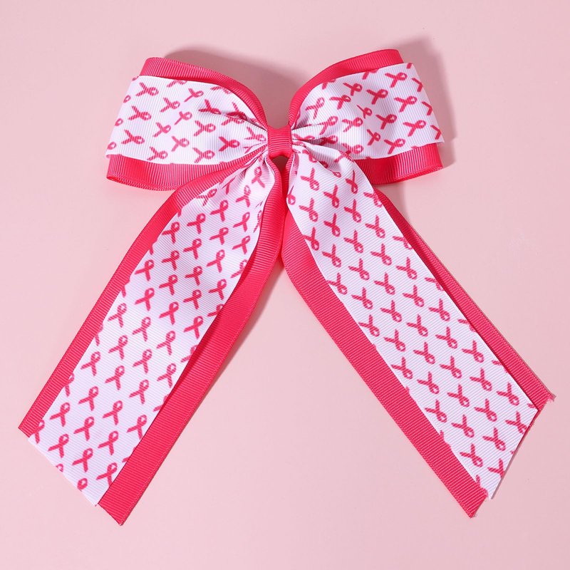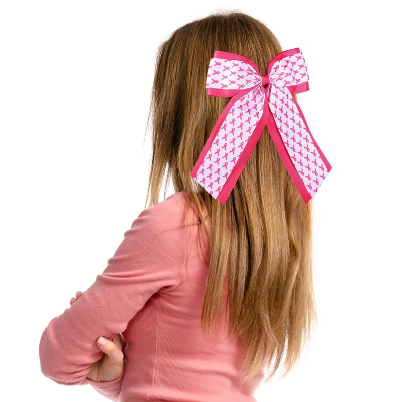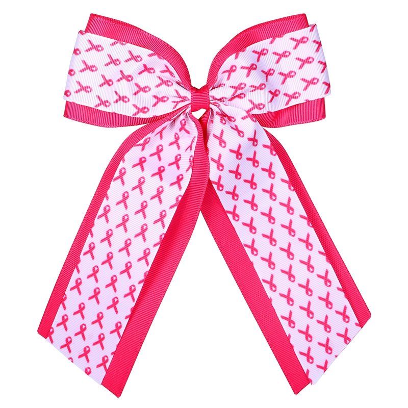 Handmade Long Tail Pink Cancer Awareness Ribbon Hair Bows- Classic breast cancer awareness ribbon cheer bow hair clip with long tail is well handmade from bontique hot pink,white colors breast cancer awareness theme grosgrain ribbons and measures approx, 5.9x8.2 inch. One size fit most ages girls and women.