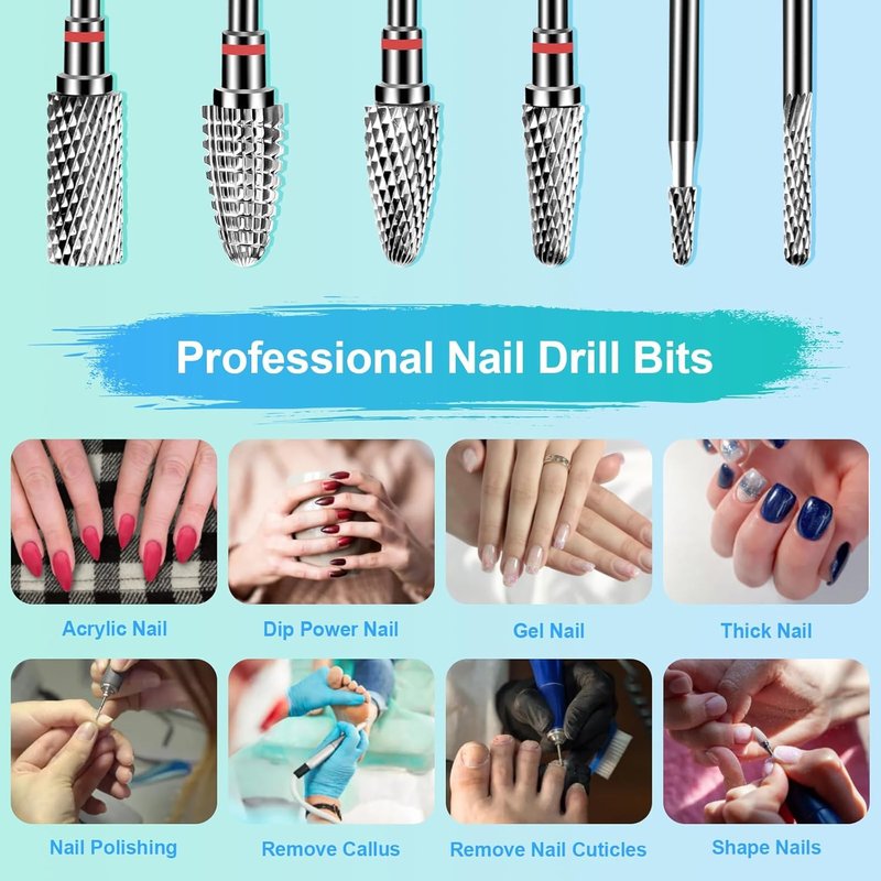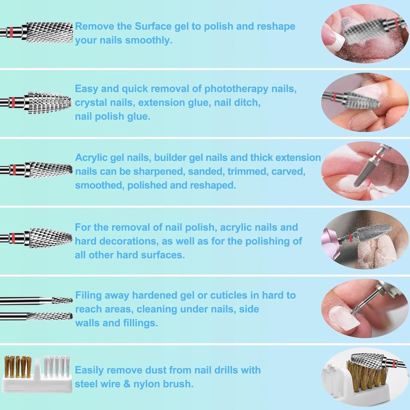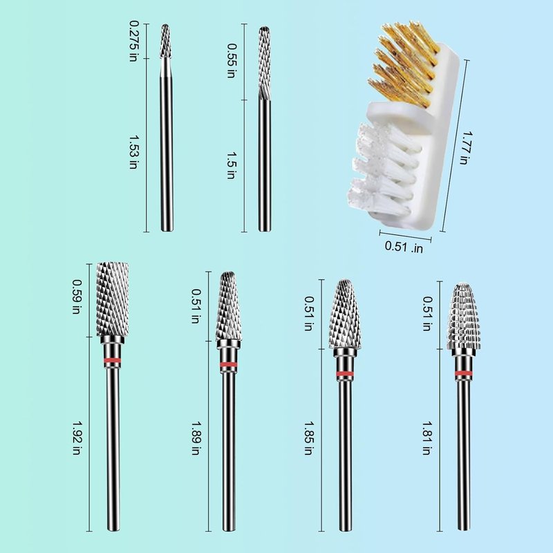 - 【Professional Nail Drill Bits Set】This nail drill bits kit contains 6 High hardness tungsten carbide bits for perfect manicures and pedicures. Includes a nail brush for versatile polishing needs. Various shapes for grinding, shaping, cutting, shaping, polishing and removing gel and calluses.