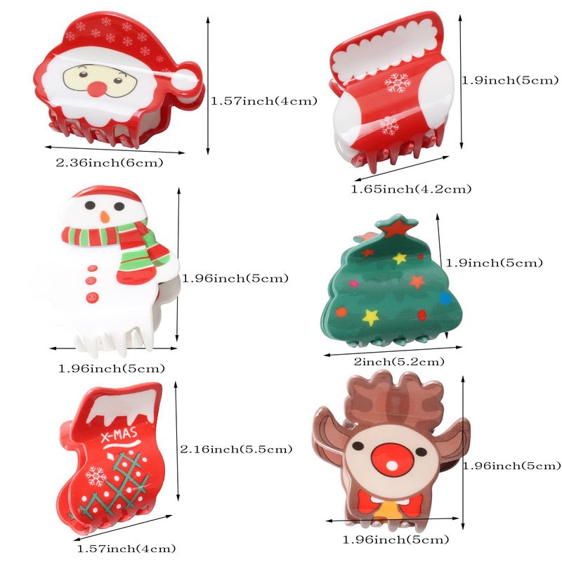 Christmas hair clamps size: snowman hair clips 1.96*1.96 inch, Santa Claus hair claws 2.36*1.57 inch,Xmas tree hair claws 2*1.9 inch, Xmas boots hair clamps 1.57*2.16inch and 1.65inch*1.9inch, elk hair claws 1.96*1.96inch,please refer to the picture