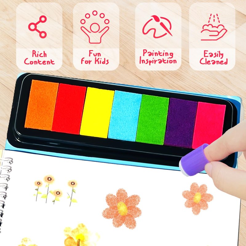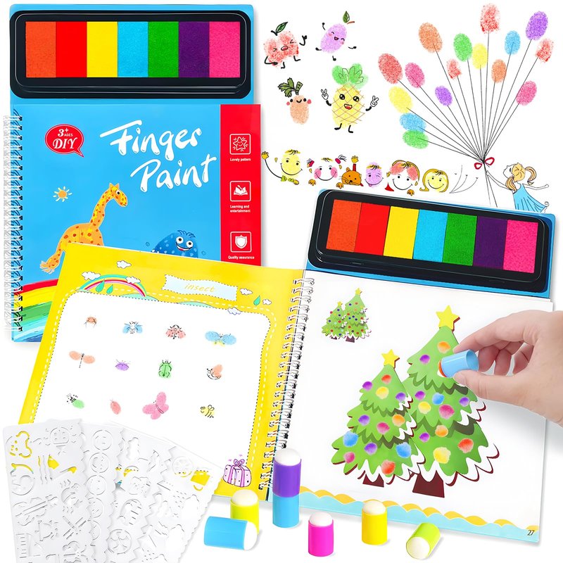 - 【Fingerprint Coloring Set】The funny finger painting kit has 7 colors paint,7 finger cots,4 painting templates,40 pages book.Children can use their fingers or with the finger cots to print,giving kid a unique creative experience.