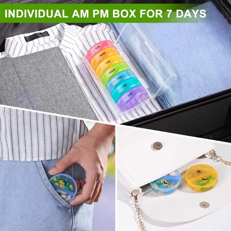- This pill compartment features AM/PM split compartments, making it easy to plan daily doses of vitamins, supplements and medication. The colored transparent lids and morning/night and day icons make it easy to quickly identify which pill goes where. The compartments are designed to be filled once per week and then you're done—no need for further organization or planning.
