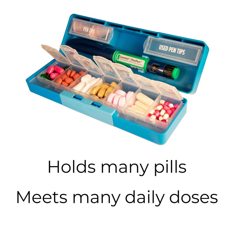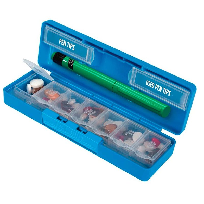 Carry your insulin pen with your oral medication. Compartments hold both new and used pen tips Hold up to seven days worth of medication Contoured pill compartment for easy removal of oral medication