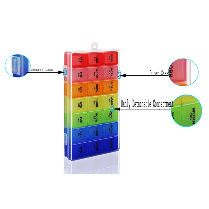 Very useful detachable compartments for seven days, day and night.easy "Snap-on" lids - easy pill organizing into AM/PM Each day of the week has a different vivid color, Take the day's box out of the frame to carry the pills for the morning or afternoon with you. Easy Scoop design - High quality plastic with one side round bottom for easy pill removal See- through lids (translucent) that can be easily snapped down for a spill-proof fit Helps in easy remembering of daily medications - useful travelling companion