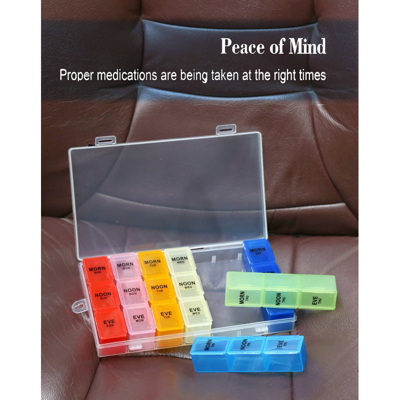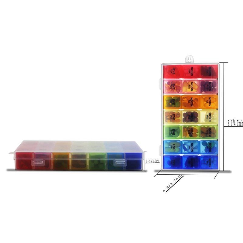 - Eliminate confusion: great reminder for all ages. It will help you to organize twice a day, 3 or 4 times a day pills with our daily compartment. Colors and letters help distinguish days of the week. Translucent organizer will be able to see whether you take your pills in time or not without opening the lid.