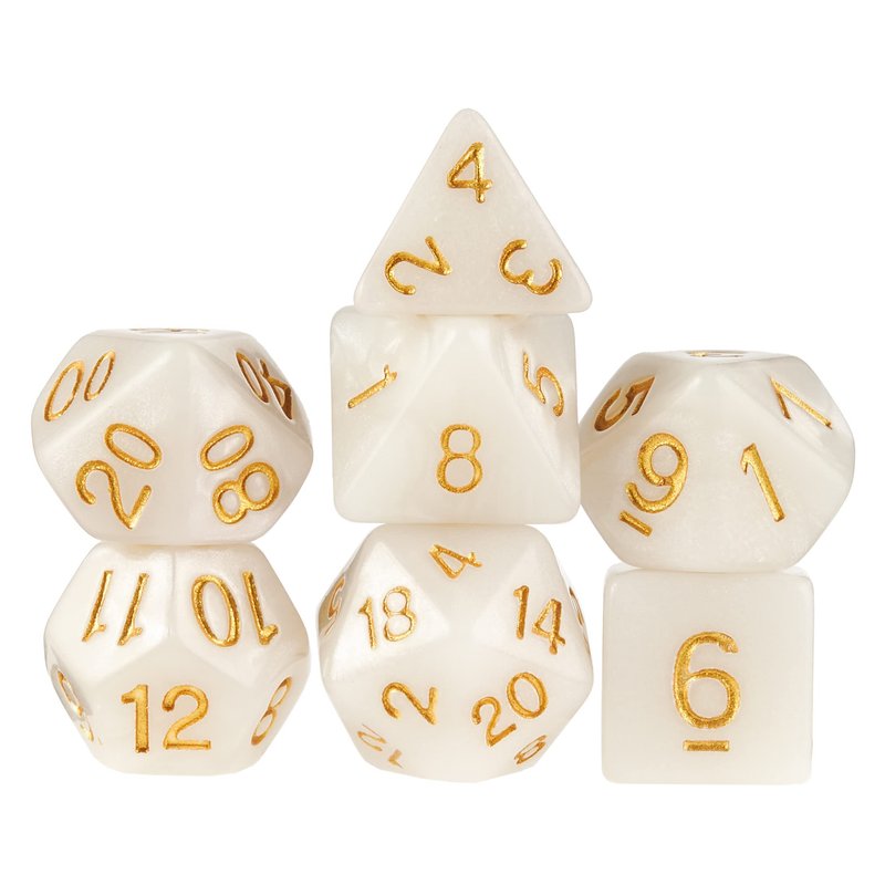 - Seven pack of Forbidden Treasure (white pearl) polyhedral dice by Wiz Dice