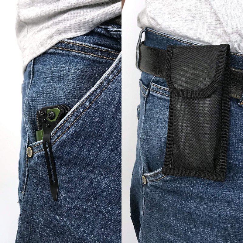 The back of the handle features a pocket clip, otherwise It comes with a nylon bag that can be attached to the belt for easy and safe carry.