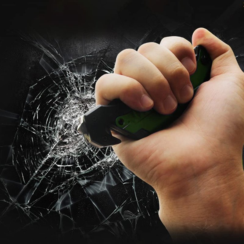 The knife comes with seat belt cutter and window breaker. Once in an emrgency condition,you can try to break the window by using the steel tip(window breaker) to hit the edge of a window. Not hit the window center where the glass has more flex.