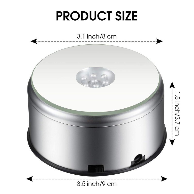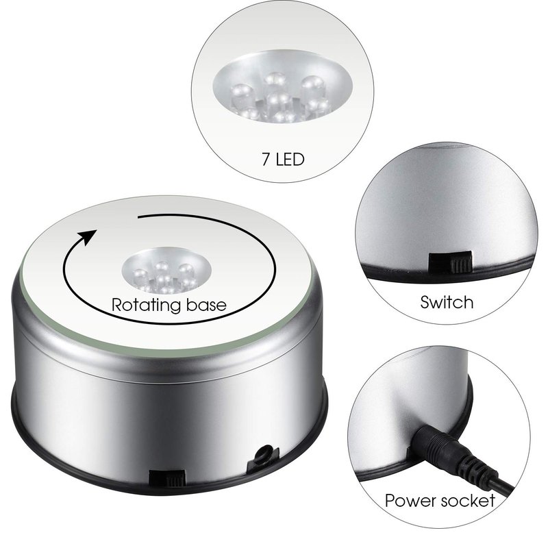 - 7 LED: come with 7 colorful LED to display your crystal glass figurine or figurines jewelry or anything within 3 inch (diameter) round, bright LED lamps display highly beautiful crystal, colorful LED lights can work at the same time and brighten up any transparent object with good effect