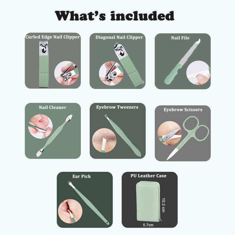 - CONVENIENT AND AFFORDABLE: This professional manicure set contains 7 tools for face, hand and foot care(Nail clippers, nail file, cuticle pusher&dirt cleaner, Multi-Purpose beauty scissors, tweezers and ear pick).And coming with a fashion,soft-touch and perfect-sized synthetic leather zippered case,it is very comfortable to carry with you in your bags or even in your pocket whenever you need.