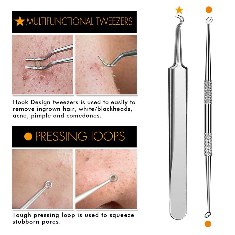 - 🎀BEST QUALITY-Blackhead Extractor Kit includes 7 professional quality tools made of Stainless Steel. The professional electroplated needle won't cause sensitivity issues and works on all types of skin.