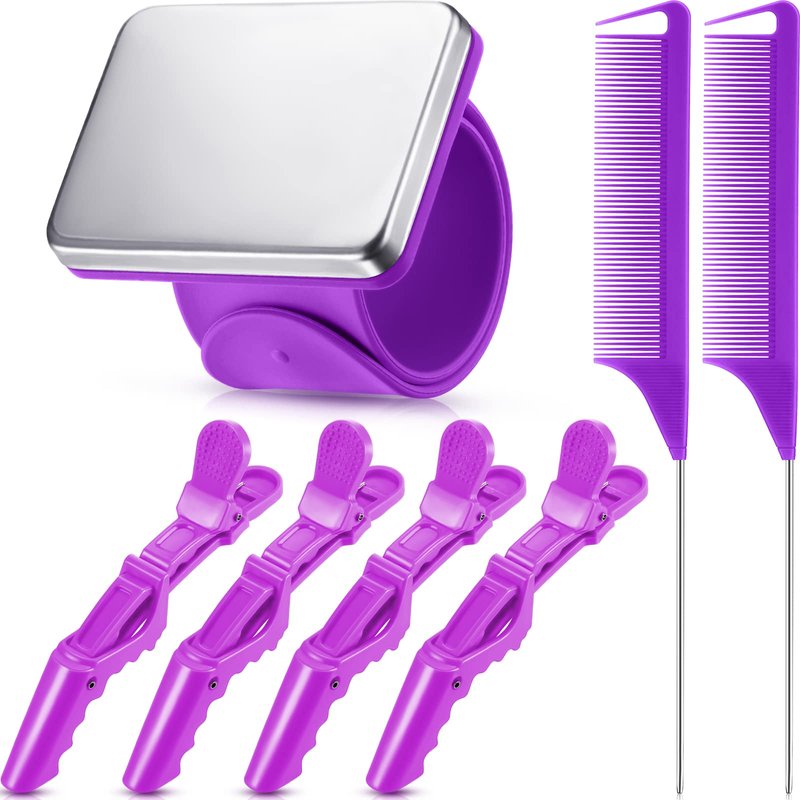 7 Pieces Hair Braiding Tools Magnetic Pin Wristband and 2 Pieces Stainless Steel Pintail Rat Tail Comb with 4 Pieces Wide Teeth Alligator Sectioning Hair Clip for Hair Braid Tool Braid Maker (Purple)