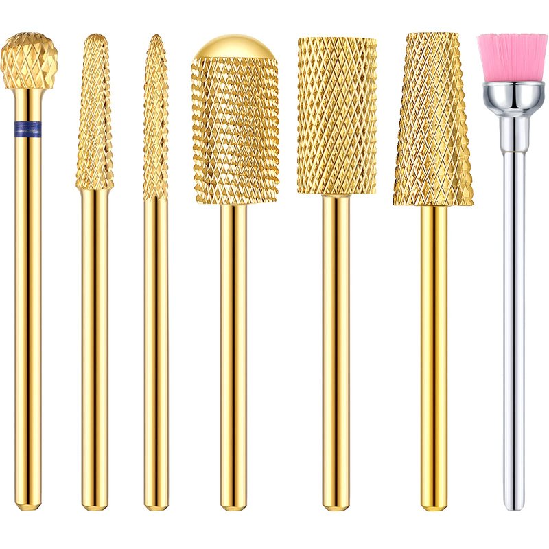 7 Pieces Nail Drill Bit Set, Tungsten Carbide Drill Bit Set, Cuticle Drill Bits Nail Bits for Nail Drill 3/32 Inch for Nail Bit Manicure Pedicure (Gold)