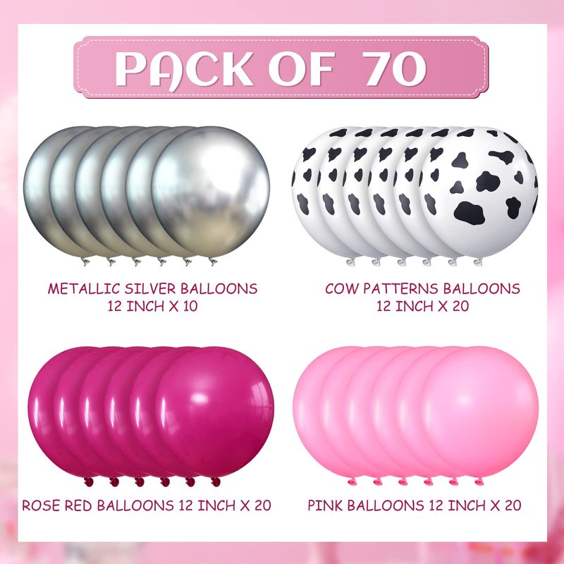 - What You Get: the package comes 20 pieces rose red balloons, 20 pieces pink balloons, 20 pieces cow printed balloons, 10 pieces silver balloons, totally 70 pieces, each balloon measures approx. 12 inches, these western balloon arch kit is a good match for your party