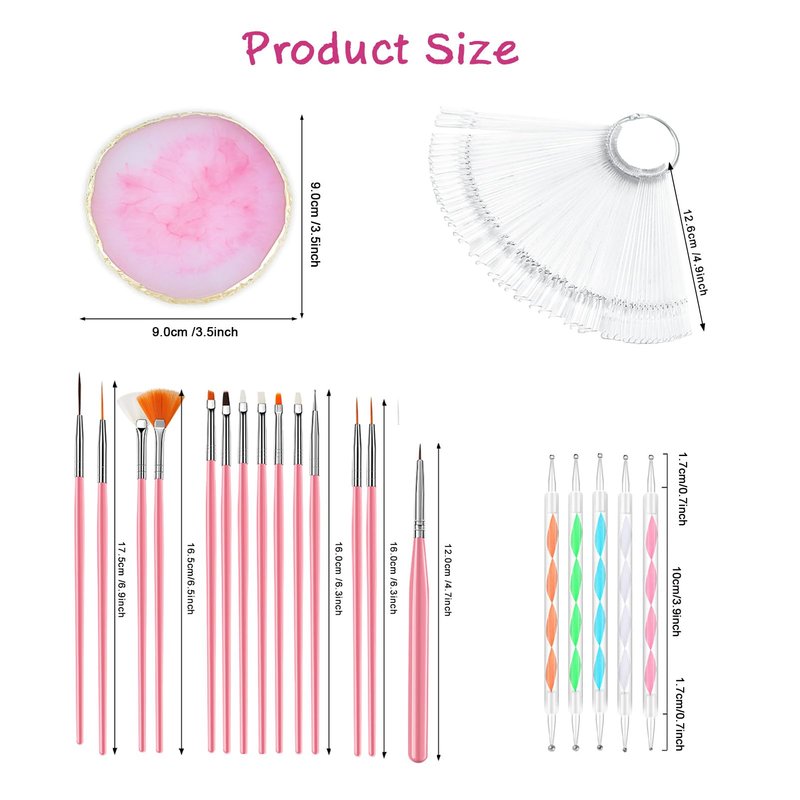 - ❤【Super Value Nail Tools】The nail art tool kit includes 1 pcs resin nail plate, 15 pcs nail art brushes and 5 pcs nail dotting pens of different size, 50 pcs clear nail swatch sticks with a ring.