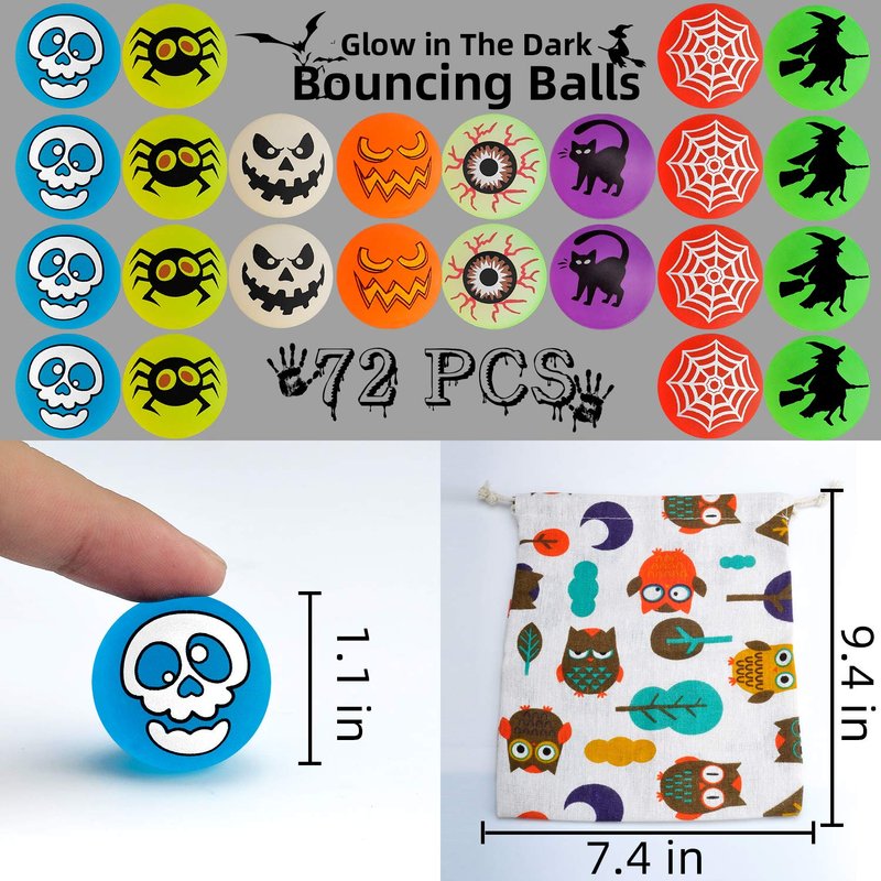 - Perfect Halloween Toys Assortment: The perfect alternative to candy and they will make you the most popular Halloween host. All kids will love it. Glow-in-the-Dark Bounce Balls included 72 pcs 28 mm Rubber Bright Glowing Bouncing Balls Assorted Halloween Designs, Which is the perfect size and easy to maneuver, even for little hands. Come with a pouch bag for easy storage.