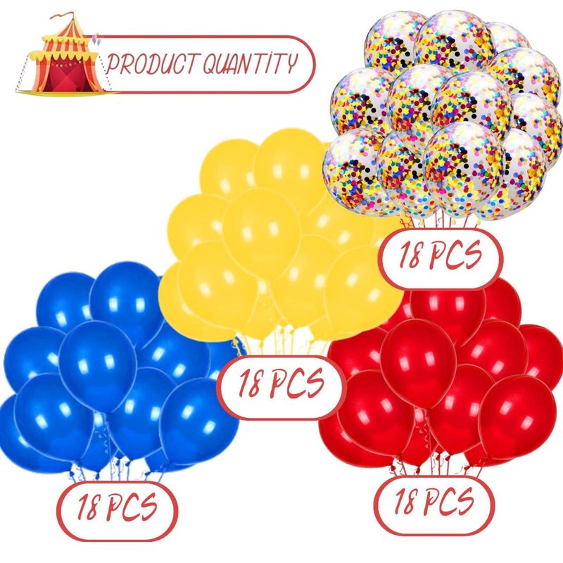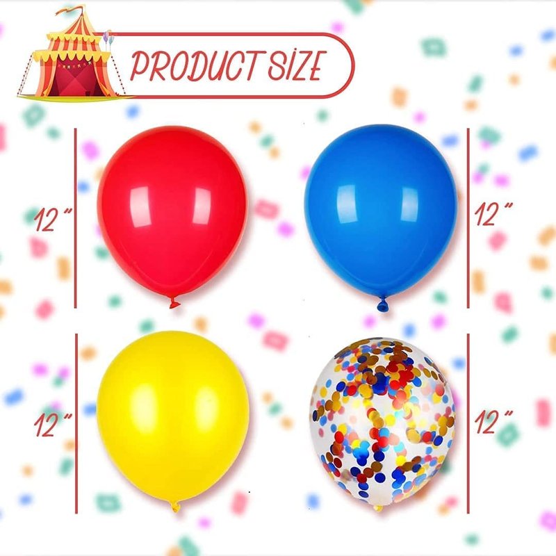 - Carnival party kit includes carnival theme balloons of 4 colors: 18pcs red, 18pcs blue, 18pcs yellow and 18pcs carnival confetti ballons, which is an excellent carnival party decorations and carnival decorations for birthday party for circus birthday party, carnival themed party decorations