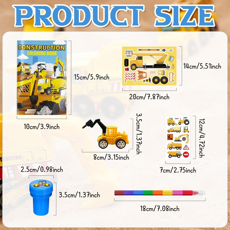 - Size Information:Tractor Birthday Party Supplies coloring books is about 4X6 inches,tattoo stickers are about 2.68 x 4.72 inches, and 8 different colors stacking crayons is about 7 inches,stampers are about 1 x 1.38 inches,DIY sticker is about 4 inch,construction vehicles is about 2 inch