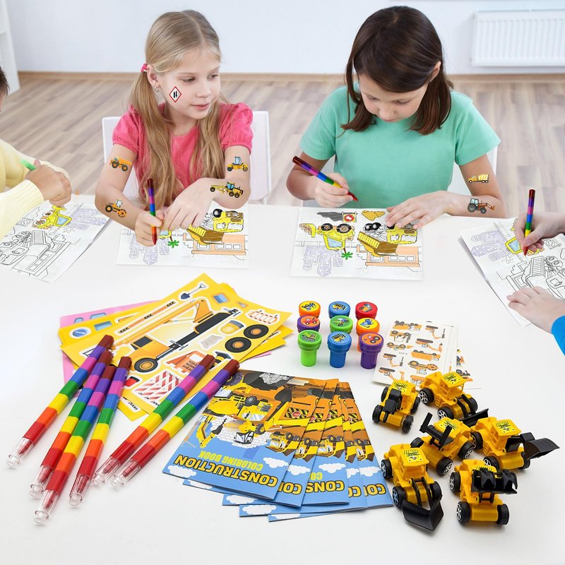 - Safe Material and Reliable Materials: the construction Goodie Bags Fillers have been strictly tested, made of quality materials, and safe with smooth surfaces; Tattoos can be easily removed with makeup remover,and our stacking buildable 8 colors crayons are made of paraffin and plastic, stamps are made of plastic, other stickers are made of paper, nontoxic, safe material, safe for children to use