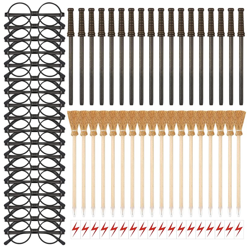 - THE MORE THE MERRIER! - Our wizard party favors are specifically made to bring your party to life as they include 72 pieces,18 glasses with round frames, 18 witch broom pencils, 18 wand pencils, and 18 lightning tattoos. Think of how fun it would be to have your friends show up with kids' wizard wands or witches' brooms.