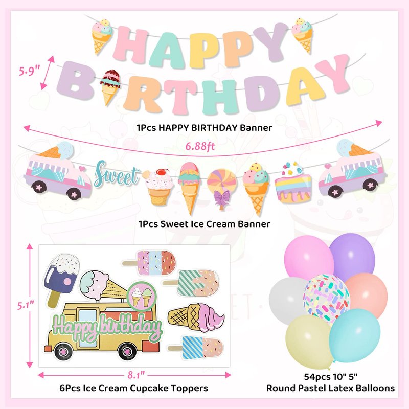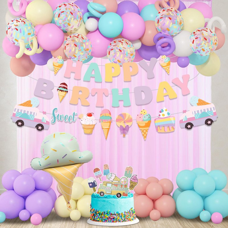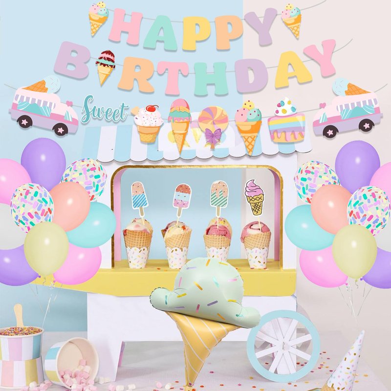 - Ice Cream Party Decorations Set: This ice cream decorations package include 1pcs cute ice cream balloon, 6pcs 12" multi colored sprinkle balloons, 6pcs 12" long twist balloons, 48pcs 10" 5"pastel macron latex balloons(rose red/purple/aqua blue/yellow/white/orange), 1pcs happy birthday banner, 1pcs ice cream theme banner, 6pcs cupcake toppers and 3pcs balloon tools. It literally comes with everything you need other than that! Create a dreamy ice cream party decorations for girls.