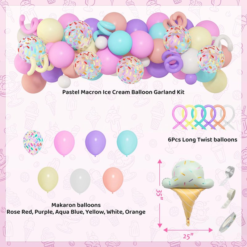 - Easy to Put Together: Easy to inflate, string up and hang! This kind of party supplies really tie the ice cream theme together. The balloon arch strip makes it easy to hold the sweet pastel balloons together. You only need to hang ice cream pastel balloon garland kit outside garden, above a party table, from a doorway or archway for a colorful layout. We also offer glue points to help you install them easily and save you time. DIY your ice cream birthday party decorations quickly.
