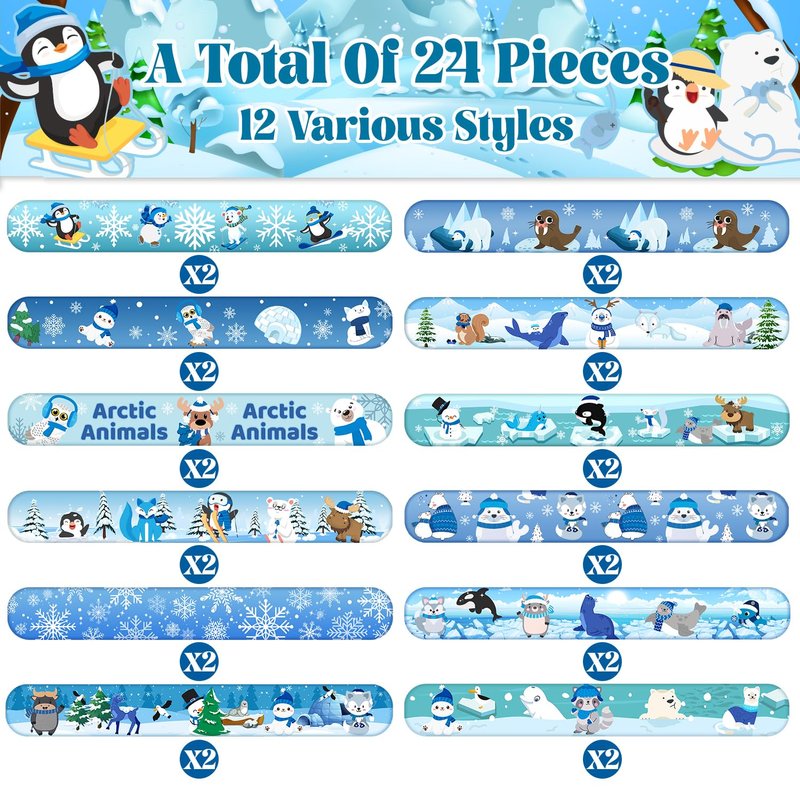 - Winter Arctic Animals Party Favors: Our package includes 24 pcs arctic animal slap bracelets in 12 styles, 2 of each color and style, 50 pcs arctic animal stickers. Enough quantity to meet your winter arctic polar animal party needs! Unique personalized pattern perfect for boys/girls gift