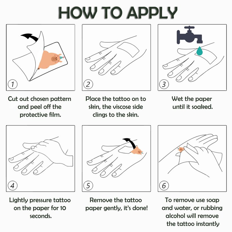 - [Usage] Lay your preferred design face down on a dry, clean surface. Next, gently pat the tattoo paper with a damp paper towel. After 10-20 seconds, take off the tattoo paper and enjoy!