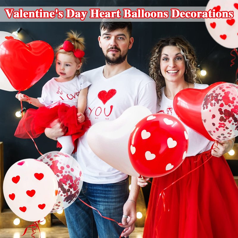 - Romantic valentine's day decoration set:Package includes 15pcs Red Heart Shape Balloons+15pcs White Heart Shape Balloons+15pcs Red Heart Balloons+15pcs White Heart Balloons+15pcs red confetti balloons+1pcs Red Ribbons.