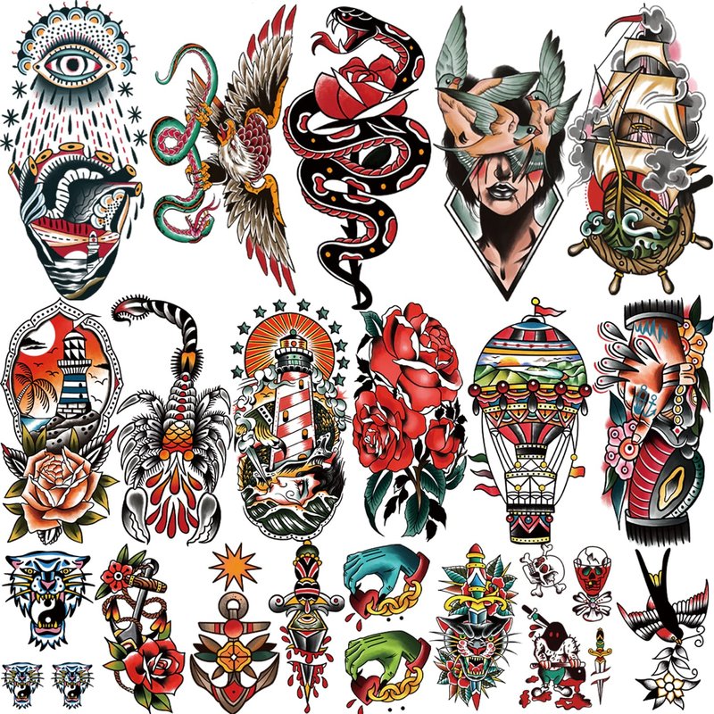 - 77 sheets american traditional temporary tattoos,17pieces 7.48*3.74 and 60pieces 3.85*2.28,including sailor,anchor,snake,eagle,sailboat,sailor, pentagram,lighthouse,heart,swallow,flower,vintage roses,swallows,demon,butterflies,sword,skull,eagle,scorpion
