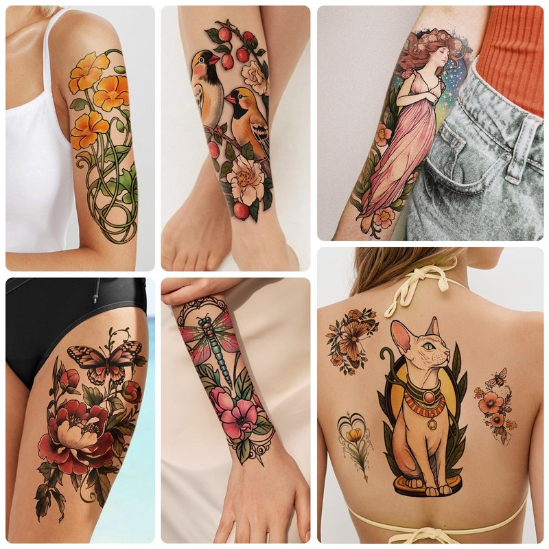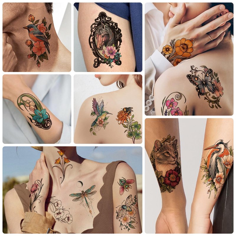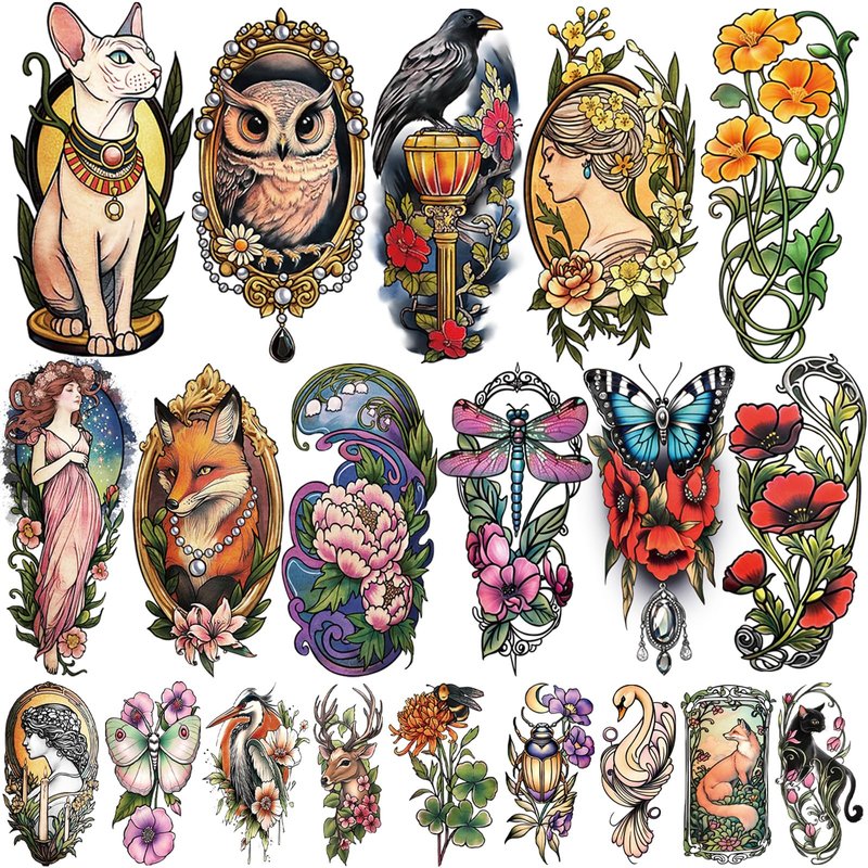 77 Sheets Temporary Tattoo, 17 Sheets Half Arm Cat Fox Owl Flower Buterfly Fake Tattoos for Adults Shoulder Neck, 60 Sheets Tiny Art Nouveau Temporary Tattoos Realistic for Women Girls and Kids
