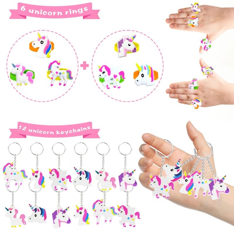 - Quantity:You will receive 12 unicorn stamps; 12 unicorn keychains; 6 unicorn rings; 12 unicorn necklaces; 12 unicorn silicone bracelet; 12 button badges with unicorn pattern; 6 unicorn mini notebooks; 6 unicorn magnetic bookmarks. Children and adults will love these cute unicorn party favor supplies!