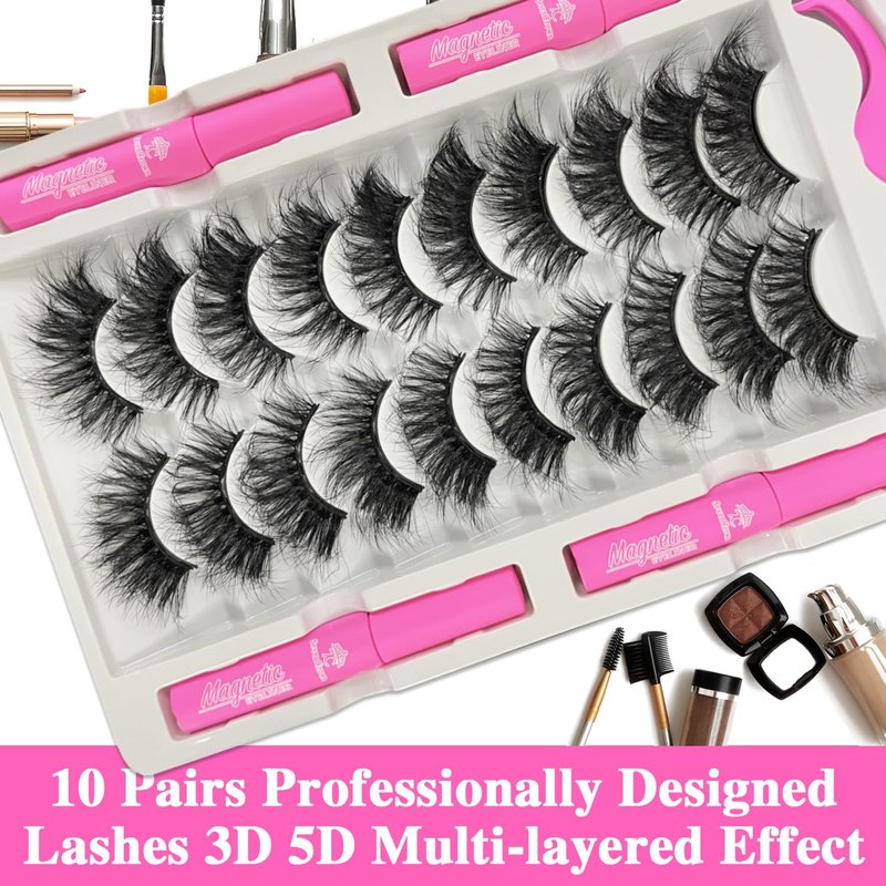 7C SevenCrown Magnetic Eyelashes with Eyeliner Kit, Fluffy Mink Lashes Cat-Eye Look 18-21MM Wispy Long 8D Luxury Volume Fake Eyelash 10 Pairs Cruelty-Free&Vegan