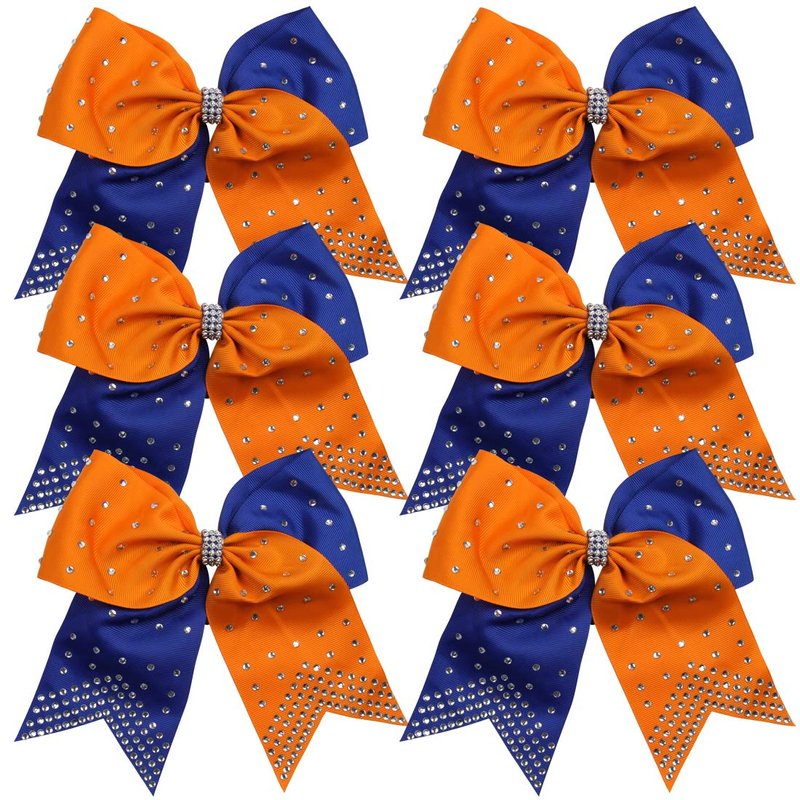 8 Inch 2 Colors Cheerleader Bows Ponytail Holder with Bling Fling Rhinestones Hair Tie Cheerleading Bows 6 Pcs (Orange/Royal Blue)