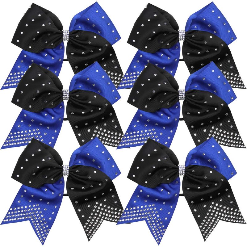 8 Inch 2 Colors Cheerleader Bows Ponytail Holder with Bling Fling Rhinestones Hair Tie Cheerleading Bows 6 Pcs (Royal Blue/Black)