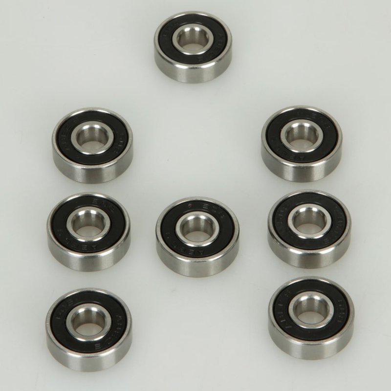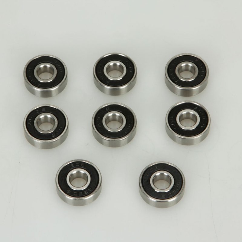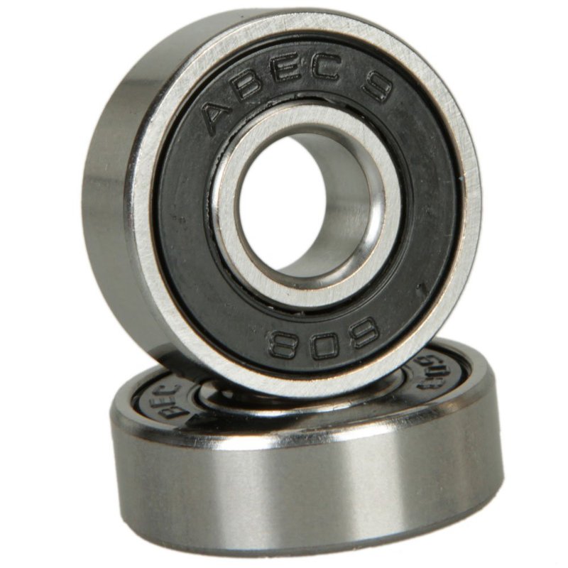 Bearing Size: 8mm x 22mm x 7mm (608-RS) - RATED ABEC 9 - Double Sealed - Precision Ball Bearing - INCLUDES 8 BEARINGS - This is the most popular size and Abec 9 rated bearing to fit skateboard wheels, scooter wheels, inline wheels, caster wheels, and also some hvac and industrial demands. The bearing size is 608 and has 2 removable rubber seals. The seals contain a carbon steel plate to assist in keeping the seal from being pushed and provides an effecting barrier against contamination. The bearing retainer (ball cage) is made of molded nylon. This retainer provides smooth and efficient bearing roll. These bearings are manufactured to precision abec 9 standards. ITEM SPECIFICS: Item: 8 Abec 9 Bearings - Size: 608-RS deep groove ball bearing - Size(inch): 0.3149in x .8661in x 0.2755in - Lubrication: Speed Oil - Seals: 2 Rubber - Retainer: Molded Nylon - Limiting Speed: 34000 - Inner Diameter: 8mm - Outer Diameter: 22mm - Width: 7mm