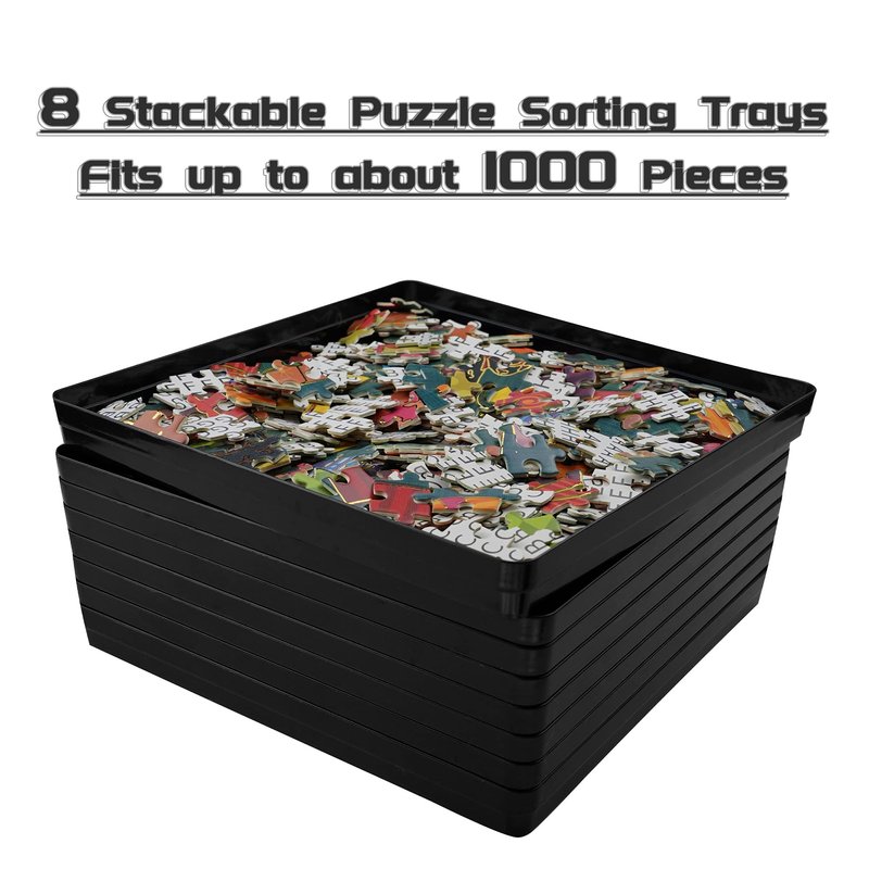 - 【8 Puzzle Organizer Trays】With these stacking puzzle trays, you can make jigsaw puzzles pieces safe, neat and tidy -- all while saving time and table space! Sort the puzzle pieces in different groups according to shape, color or pattern, then store them separately in dedicated puzzle keeper.