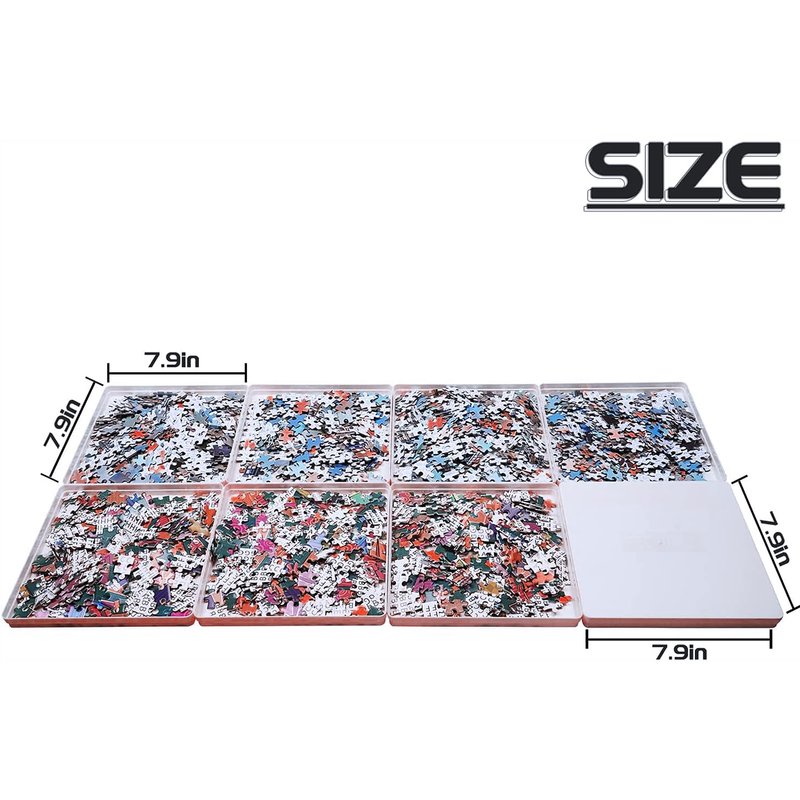 - 【Fits up to 1000 Puzzle Pieces】These puzzle sorters and organizers apply to puzzles 500 pieces and 1000 pieces. Now you can tackle your favorite size without the need to shove multiple tables together. Each sorting puzzle trays measures 7.9"x7.9"x0.7". It’s lightweight and easy to carry.