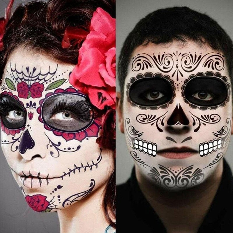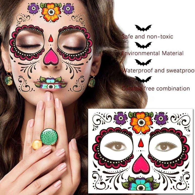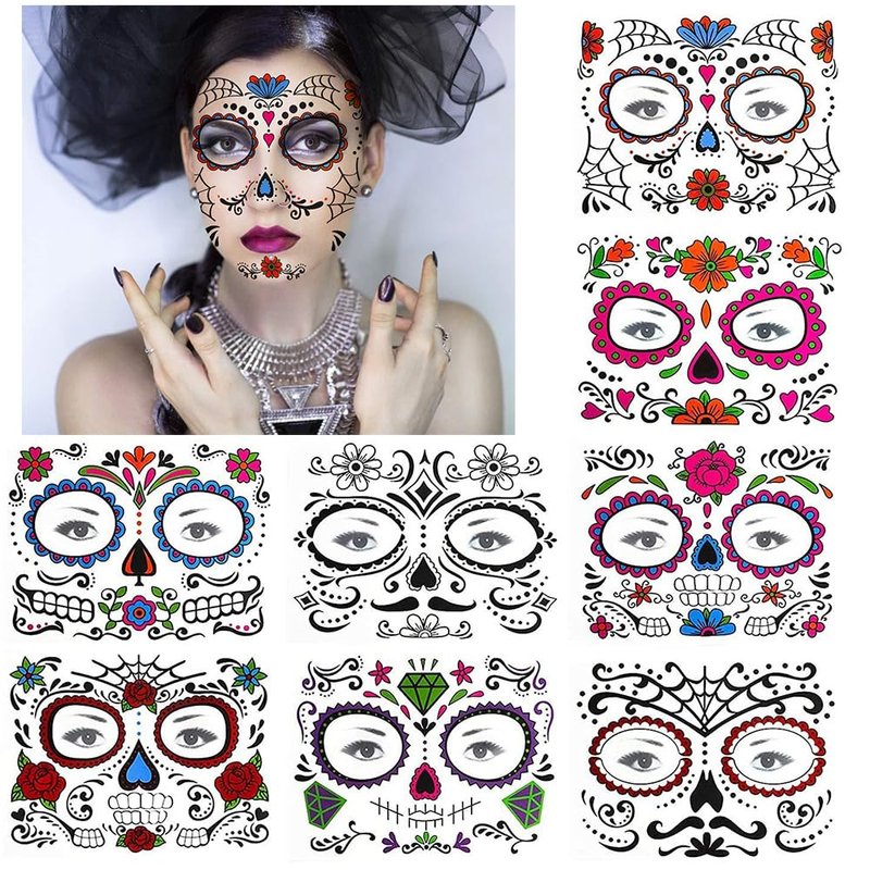 8 Sheet Day of the Dead Face Tattoos, Realistic Face Halloween Temporary Tattoo Stickers for Festival Makeup Rave Accessories, Halloween Face Tattoos for Halloween Cosplay