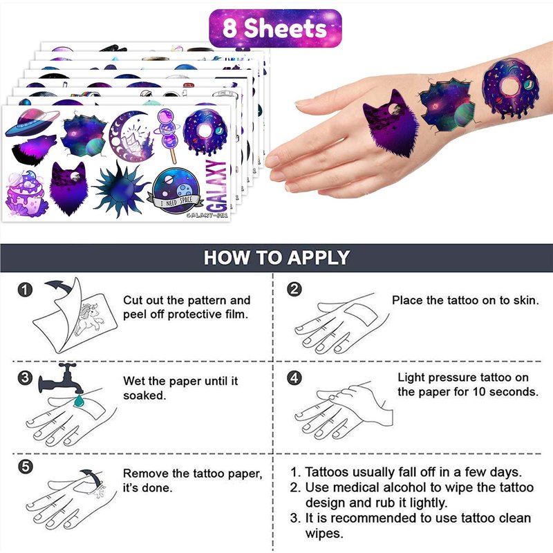 🚀PACKAGING INCLUDE: You will be provided with a set of eight sheets with 88 pieces that measure around 6.1 x 3.1 inches in dimension. With this package, you can make your special birthday celebration more delightful and cater to a gathering. Galaxy party supplies are great for starry themes, baby showers, birthdays, space exploration, and more. They're perfect for those who love the galaxy and satisfy our fascination with space. 🌌BEAUTIFUL DESIGN: Our collection of tattoos for your space party showcases intricate designs of constellations, galactic formations, celestial bodies, and shooting stars. These designs come together to create a captivating and enigmatic space-themed ambiance that will undoubtedly elevate your gathering. ♻️SAFE AND HIGH QUALITY:Our temporary tattoos are crafted with utmost care and precision using only the finest quality green and safety paper. This paper is made from non-toxic and ecologically safe materials, ensuring that our products are not only visually appealing but also safe to use. We take great pride in the quality of our tattoos and make no compromises when it comes to the safety of our customers 📌USAGE: To begin, simply peel off the transparent paper from the sheet prior to cutting out the tattoo. Then, carefully apply it to a protected area like your hands, arms, or face, or even on surfaces like a glass, bag, water bottle, laptop, or phone case. Once applied, moisten the tattoo with a few drops of water, wait for 20-30 seconds, and then remove the backing paper. Voila! You now have a stunning velvety tattoo that can be easily removed with just water, soap, or baby oil. 💌CUSTOMER SERVICE: If you have sensitive skin, we advise against using this product. In case of any symptoms, please stop using it immediately. Our team is always here to help and make sure you have a positive shopping experience. Please do not hesitate to contact us for assistance.