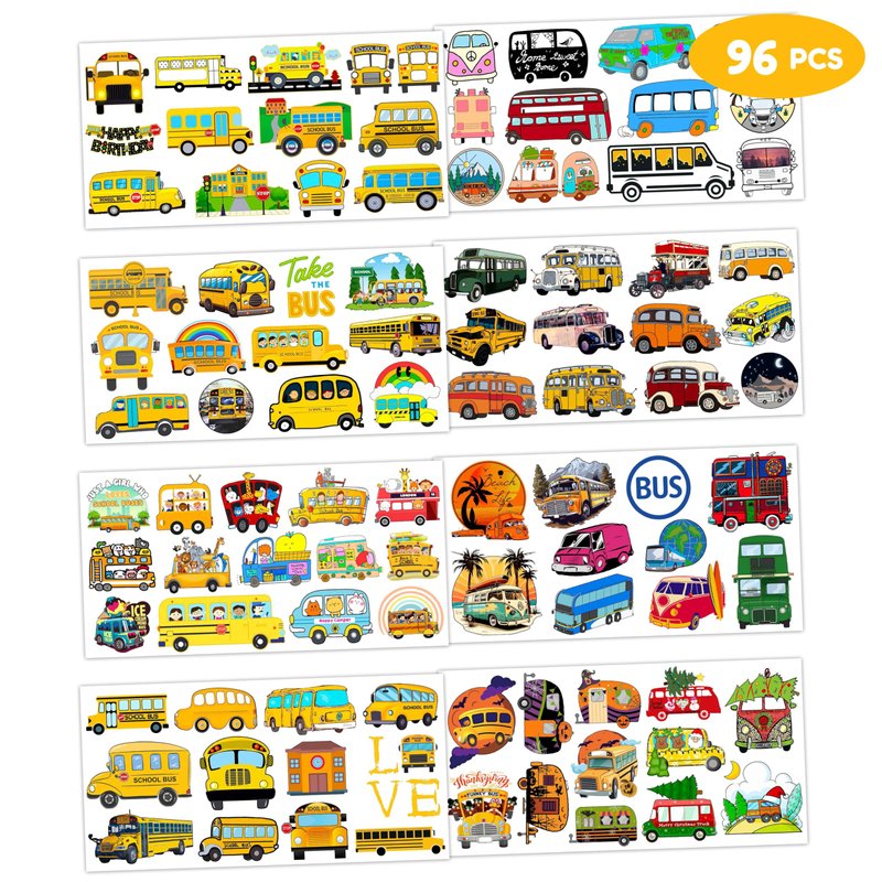 8 Sheets (96PCS) Bus Temporary Tattoos Transportation Themed Birthday Party Decorations Supplies Favors Bus Stickers for Kids Gifts Classroom School Prizes Rewards
