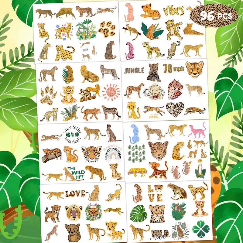 8 Sheets (96PCS) Cheetah Tattoos Temporary Jungle Theme Birthday Party Supplies Favors Decorations Tattoo Stickers for Boys Girls Gifts Classroom School Prizes Rewards