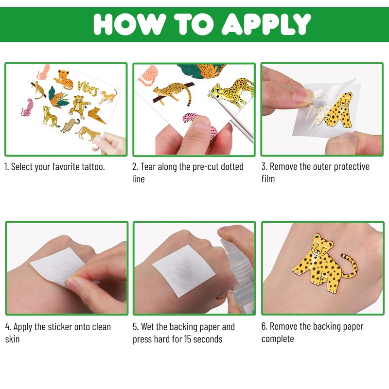 🐆PACKAGE INCLUDE: Looking for some fun party favors? We've got you covered! Our pack includes 96 cheetah tattoo stickers spread across 8 pages. These stickers are the perfect addition to any celebration and are suitable for all ages. With a size of 6.1 by 3.1 inches, they're sure to make a statement. 🌳CHEETAH PARTY: Temporary cheetah tattoos are an absolute must-have for birthday parties, spring events, and cheetah-themed gatherings. These stickers showcase fierce jungle creatures like cheetahs and leopards, making them an outstanding gift for kids. Children who use these tattoos at parties experience nothing but pure happiness and delight, without a single trace of sorrow. ♻️SAFE AND HIGH QUALITY: Our temporary tattoos are crafted with utmost care and precision using only the finest quality green and safety paper. This paper is made from non-toxic and ecologically safe materials, ensuring that our products are visually appealing and safe to use. We take great pride in the quality of our tattoos and make no compromises when it comes to the safety of our customers. 📌USAGE: Before removing the tattoo, it's essential to take off the clear paper from the sheet. You can choose any covered surface like your arms, hands, face, or objects like a water bottle, purse, laptop, or phone case to apply the product. Wait for 20 to 30 seconds, sprinkle a few drops of water on the tattoo, and take off the backing paper. You'll end up with a gorgeous, velvety tattoo that can be easily removed with baby oil, soap, or water. Go ahead and enjoy your stunning new look! 💌CUSTOMER SERVICE: If you have sensitive skin, we advise against using this product. In case of any symptoms, please stop using it immediately. Our team is always here to help and make sure you have a positive shopping experience. Please do not hesitate to contact us for assistance.